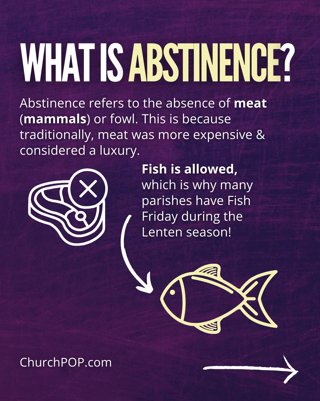 Abstinence is a penitential practice consisting of refraining from the consumption of meat and is to be observed by all Catholics who are 14 years of age and older. Ash Wednesday, Good Friday, and the Fridays during Lent are days of abstinence.